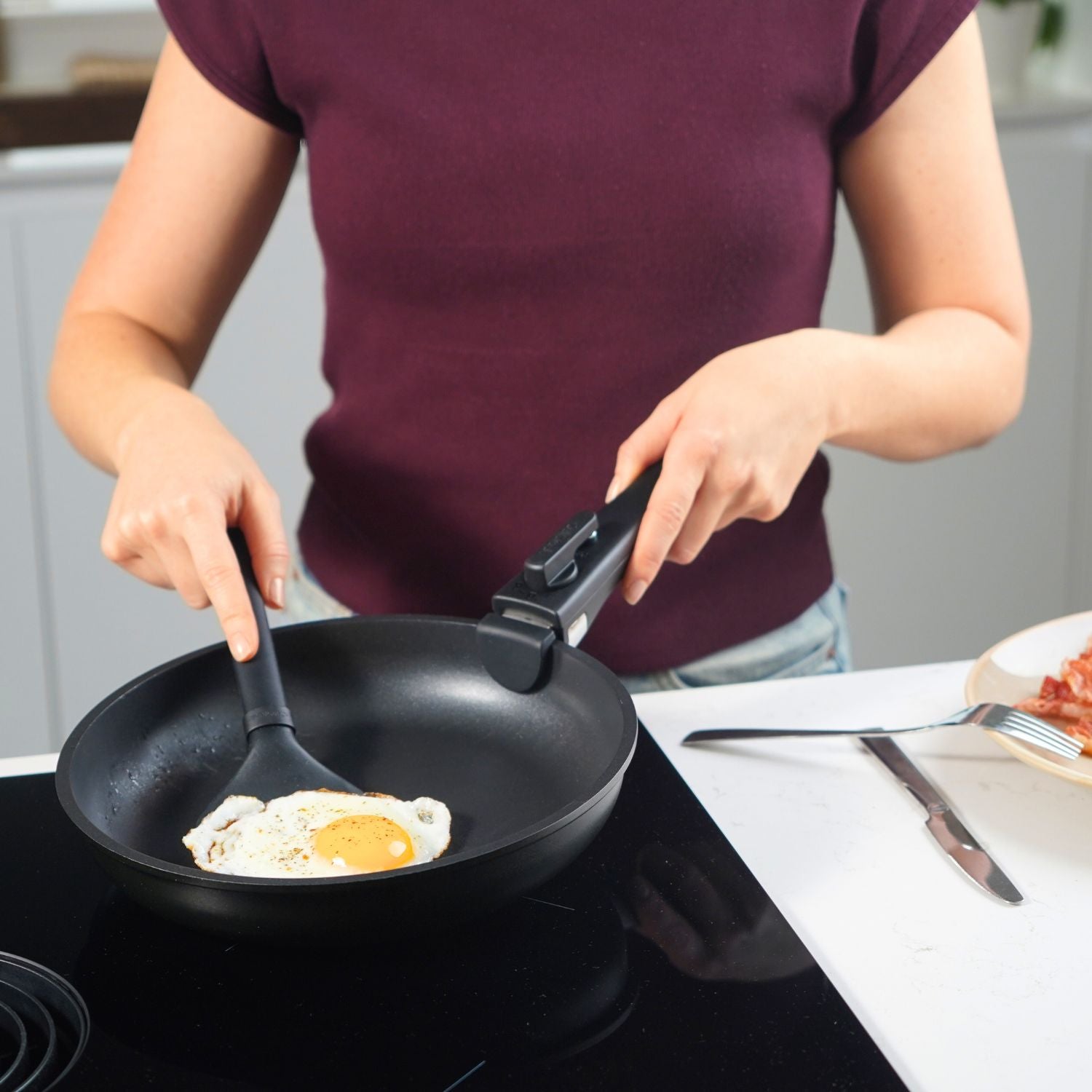 Der Boden besteht aus 4,5 mm recyceltem Aluminium, was für eine schnelle und gleichmäßige Wärmeverteilung sorgt. Dank der vollständig integrierten Edelstahlschicht für Induktion arbeiten die Pfannen besonders effizient auf Induktionskochfeldern, mit einer schnelleren Aufheizung, geringerem Energieverbrauch und optimaler Temperaturkontrolle.